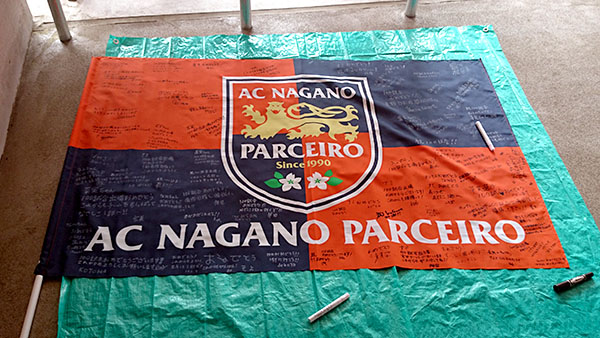 キャプテン田中選手が前節100試合出場達成で今日は試合後に記念セレモニーがあるとの事。サプライズでサポーターから寄せ書きLフラッグを送るそうなので協力しました。