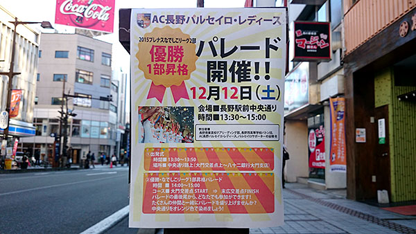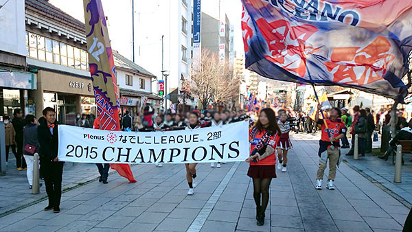 パルセイロ・レディースのなでしこリーグ2部優勝&1部昇格の祝賀パレードが行われました。パルセイロの優勝パレードと言えば勿論!長野市の中心市街地,中央通りを大門から末広までサポーターも一緒になっての練り歩きです。