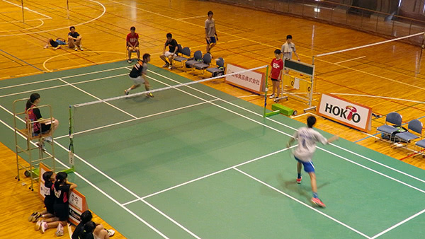 試合はダブルス3試合とシングルス3試合を2セットずつ行い総スコアで勝敗を決める団体戦,コート3面を使い3試合同時進行です。何枚か写真を撮ってみましたがやはり難しい。