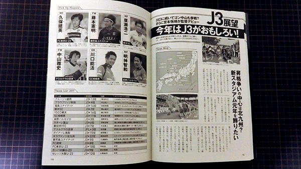 J3クラブは見開き2ページ,全選手の顔写真とパーソナルデータ・寸評。2/8発売にも関わらず1/29に行われた新体制発表会のネタが既に載っています。