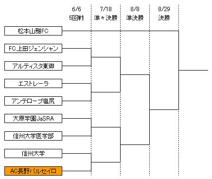 天皇杯予選を兼ねた第15回長野県サッカー選手権はGW中に4回戦まで終了しました。5回戦以降のトーナメント表は下記のとおり,今年はJFLシードもあり変則トーナメントになっています。パルセイロは5回戦からの登場で6/6に信州大学と対戦,大原学園にて13:00キックオフ予定です。大原学園って事は久しぶりに菅平かあ,と思っていたら当日は同時刻に南長野でレディースのホームゲームですね。むむむ。