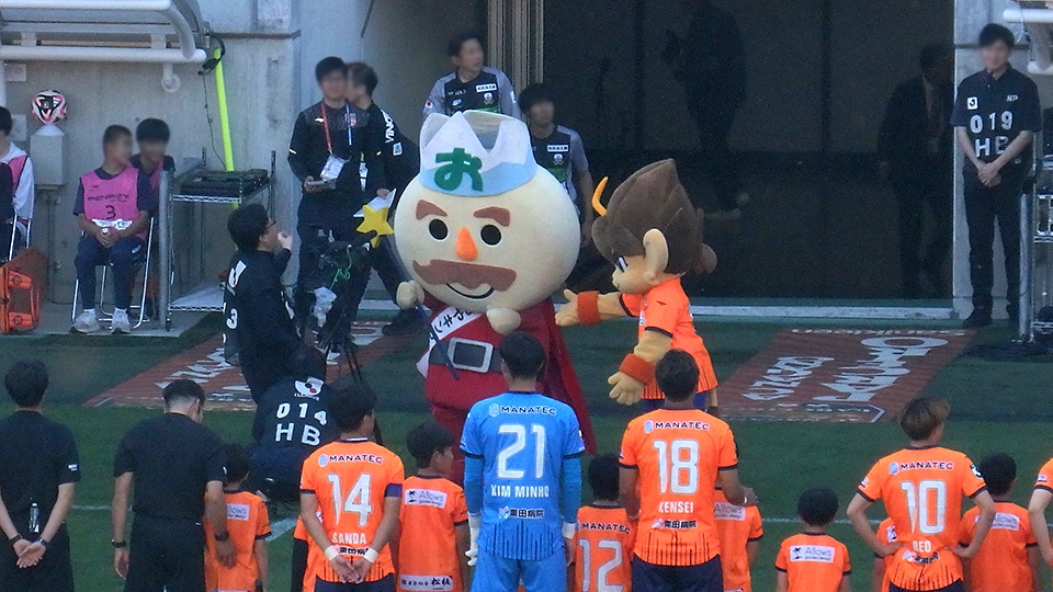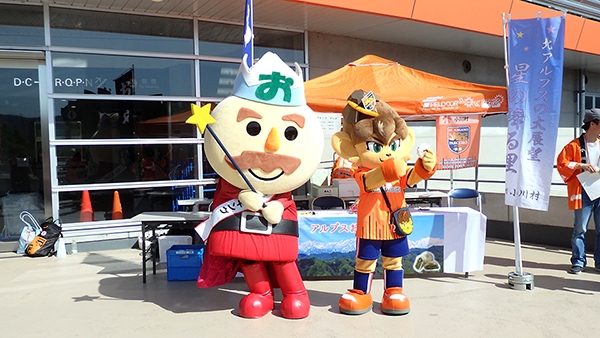 今回は小川村のホームタウンデーということで小川村PRキャラクターのおやキングが来場,ライオーもお手伝いしながら名物のおやきを販売していました。岐阜サポーターさんがおやきを頬張りながら歩いている姿も。