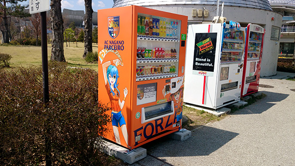 工事とは関係ありませんがいつの間にか第二駐車場前にパルセイロ自販機が。今まで噂で聞いたり写真を見た事はありますが三人娘バージョンの実物を見るのは初めてです。ピンク髪の娘は写っていませんがちゃんと右側面に居ますので好事家の皆様も安心(?)です。