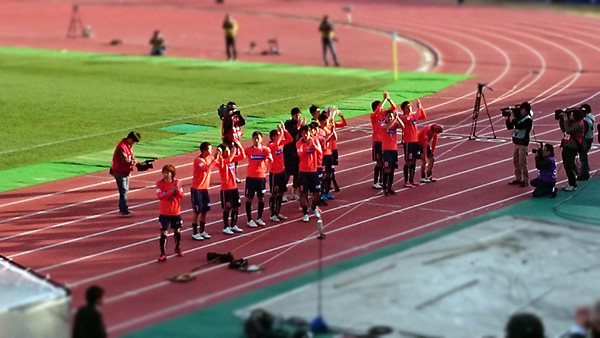 試合は序盤からパルセイロが攻勢もなかなか盛岡の守備を崩せずフラストレーションが溜まったまま0-0で後半へ。後半もパルセイロが攻めて59分に佐藤選手のゴールで先制,これで勢いが付いたのか64分には宇野沢選手がGKの頭を超える技ありゴールで久しぶりに得点を挙げると72分にも追加点を決め終わってみれば3-0の完勝。5000人を超えるサポーターで埋まった東和田が大いに沸きました。