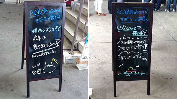 コンコースに置かれたウェルカムボード,最近は色々な会場でこういったおもてなしがあって楽しみです。最初右側に書いてある『相模原のカタキ』の意味が判らず,むしろSC相模原には痛い敗戦を喫してるけど…?と思っていましたがこれは昨日レディースが大勝したノジマステラ神奈川相模原戦の事だったのですね。