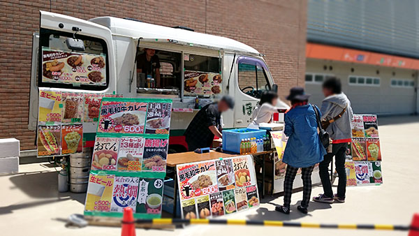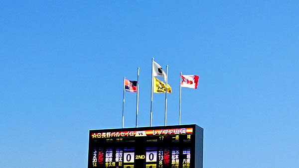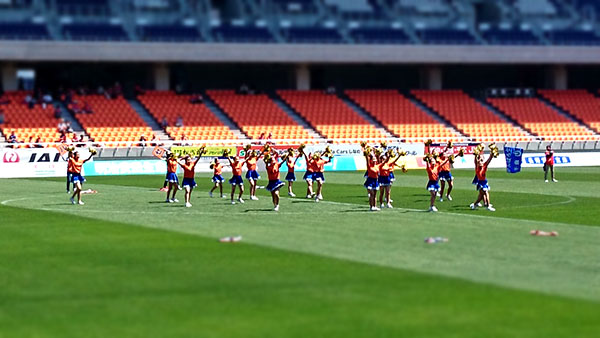 ご飯を食べながら 千曲キューティ・アンズ さんのチアリーディング。盛り上がりそうな派手な技もやっていたけれど,残念ながら選手の入り待ちと時間が被ってスタンドはまばら。これはちょっと勿体無いなあ。