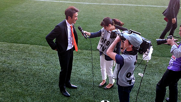 試合後の美濃部監督インタビューは明るい表情。試合終了時の派手なガッツポーズも印象に残っています。